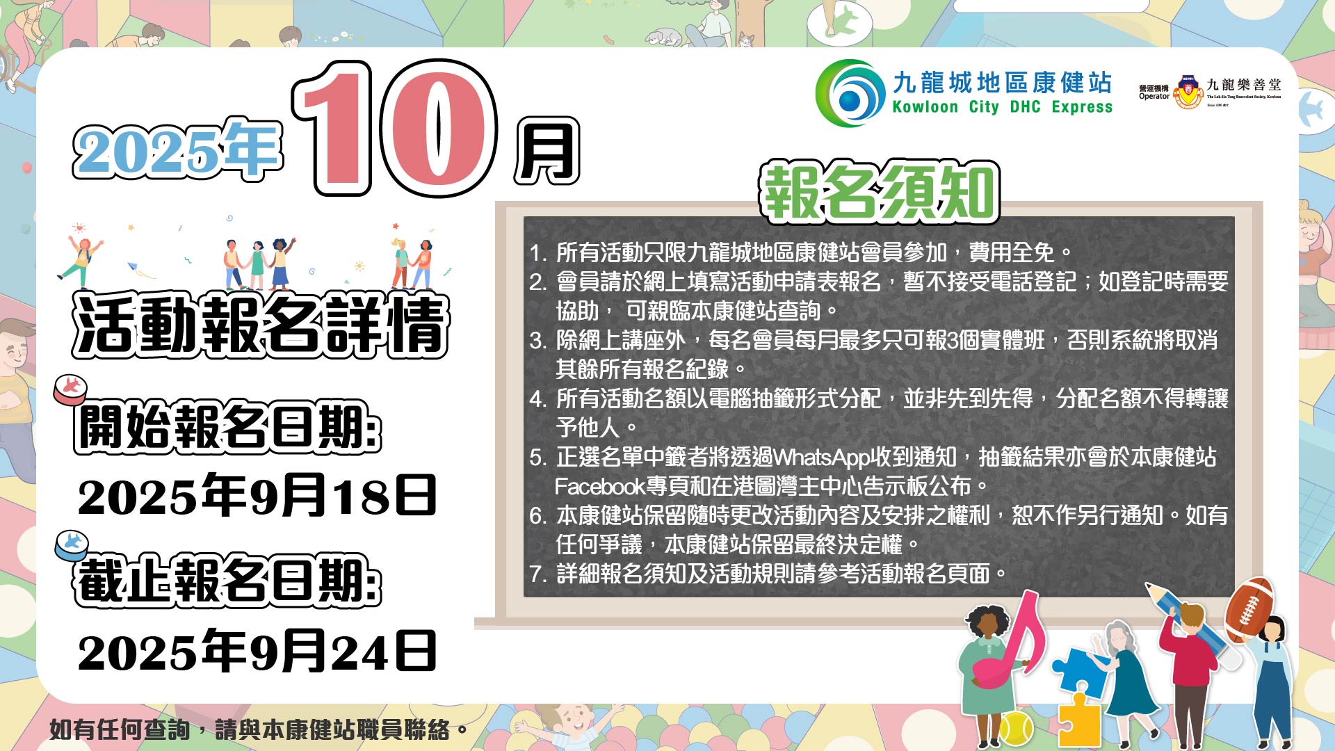 - 活動簡介: 為鼓勵市民培養將步行融入日堂生活,一起行出健康人生路,18區地區康健中心及康健站攜手合辦「Chill住行 - 超健康 - 區區行 - 步步Fit」活動 參加資格: 九龍城地區康健站會員 (歡迎邀請家庭成員一同參與及登記成為會員) 活動要求: • 挑戰康文署「健步行」中18區建議路線 (請參考以下連結) https://bit.ly/4nPhKfM • 每完成一條路線,於路線打卡合照紀錄(相片備有路線名稱相關物件,如: 指示牌、路牌、門牌等) • 登記後,康健站職員將會聯絡閣下並指示將打卡合照上載,以便確認參加者獲獎資格 • 於職員確認參加者獲獎資格後,參加者可於辦公時間內前往九龍城地區康健站主中心領取奬勵 獎勵: 🥇 完成6條路線:可獲限定金奬磁石貼一枚 🥈 完成3-5條路線:可獲限定銀奬磁石貼一枚 🥉 完成1-2條路線:可獲限定銅奬磁石貼一枚
