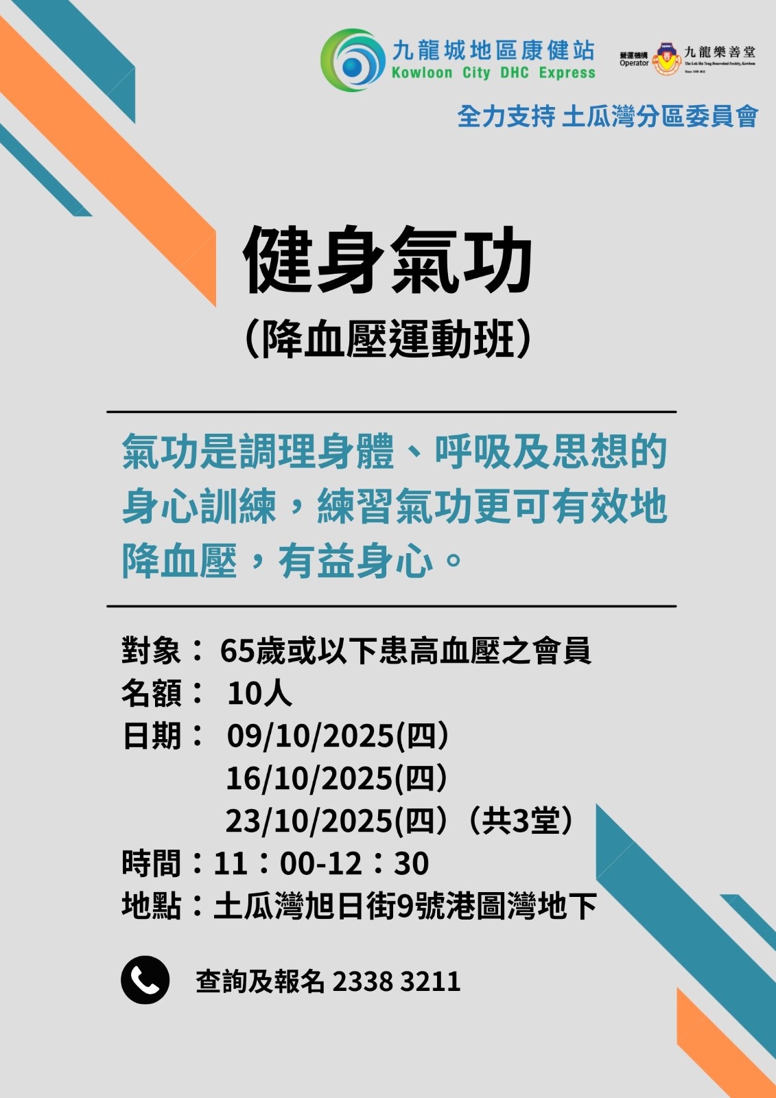 - 本班組對象為65歲或以下,患高血壓之會員。 氣功是調理身體、呼吸及思想的身心訓練,練習氣功更可有效地降血壓,有益身心。 第一堂為09/10 1100-1230 第二堂為16/10 1100-1230 第三堂為 23/10 1100-1230