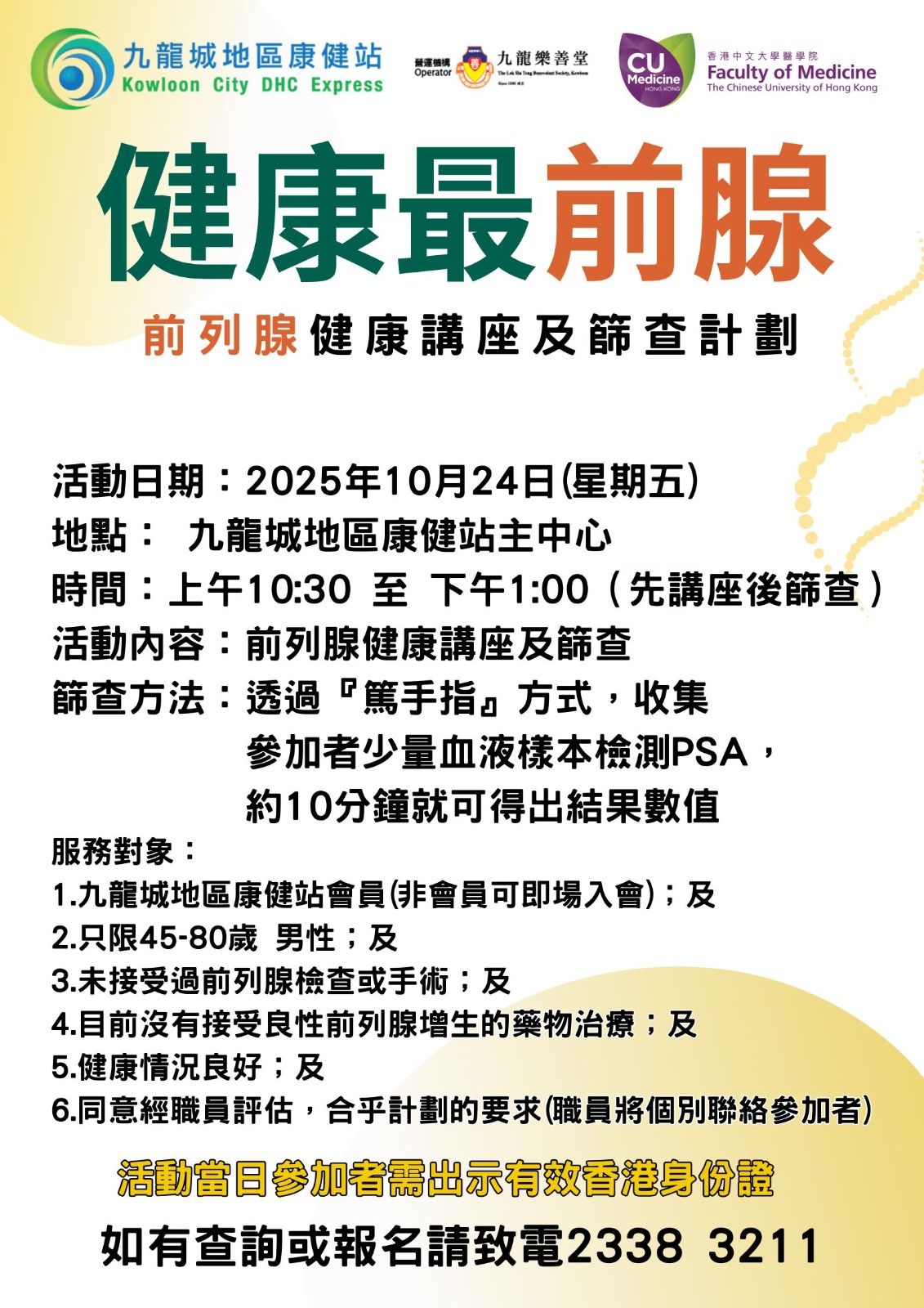 - 活動日期:2025年10月24日(星期五) 地點: 九龍城地區康健站主中心 時間:上午10:30 至 下午1:00(先講座後篩查) 活動內容:前列腺健康講座及篩查 篩查方法:透過『篤手指』方式,收集參加者少量血液樣本檢測PSA,約10分鐘就可得出結果數值 名額:20位 服務對象: 1.九龍城地區康健站會員(非會員可即場入會);及 2.只限45-80歲 男性;及 3.未接受過前列腺檢查或手術;及 4.目前沒有接受良性前列腺增生的藥物治療;及 5.健康情況良好;及 6.同意經職員評估,合乎計劃的要求(職員將個別聯絡參加者)